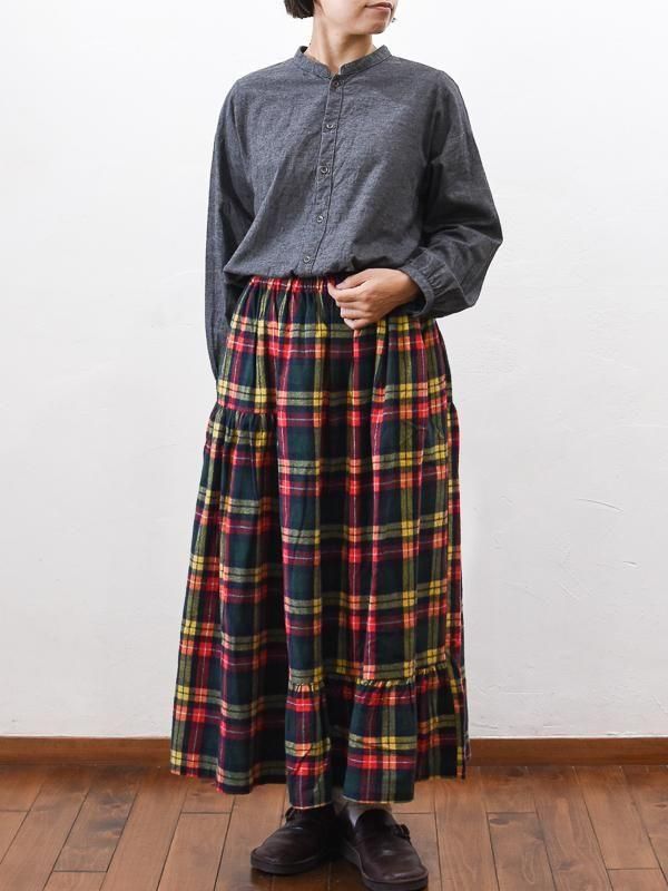 両サイドには便利なシームポケット付き。ウエスト部分は、ゴム仕様なのでインスタイルも気軽に楽しめます。鮮やかなチェック柄でシックになりがちな秋冬のコーディネートを華やかにしてくれます。
