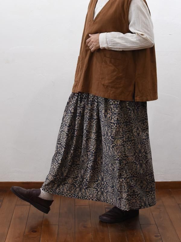 程よいボリュームがあり軽やかな印象で着こなせるスカート。 ウエストは2本のゴムでギャザーを寄せてあり、しっかりとフィットした着用感。歩くたび、ふんわりと揺れる姿はカジュアルさの中にも上品さがあり、幅広い着こなしに活躍するアイテム。
