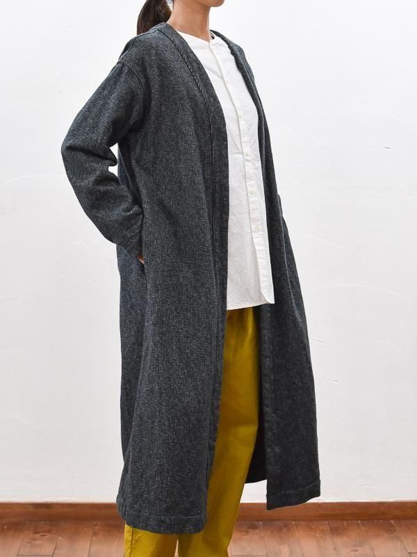 さっと気軽に羽織れるノーカラーのロングカーディガン。フロントにはボタンのないすっきりとシンプルなデザイン。丈感もしっかりありワンピース、スカート、パンツ、どんなスタイルともバランスよく着用していただけます。